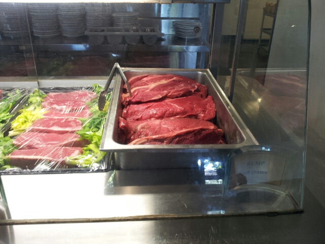 カウンターで肉を購入し、その肉をもって大型のグリルのところまでいき自分で焼きます。バーベキューです。自分で焼くためレアだとか、ミディアムだとかは自分の焼き方次第。焼きあがったら、皿に肉を置き、再びカウンターに戻ります。そして、付け合わせのポテトやサラダ、グレイビーソースなどをさらに盛れるだけもっていきます。食べ放題ではないので、取り直しにくるこはできないので、大食の方はここでたくさん乗せていきます。