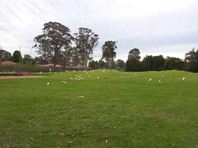 夕暮れのゴルフコース と コースにいる白いオウム(カカドゥー)